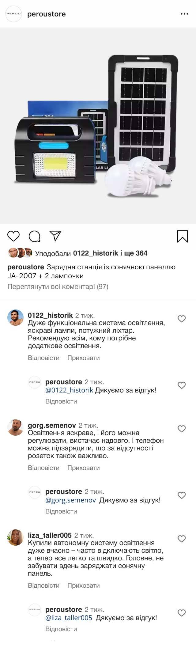 Потужний ліхтар та дві світлодіодні лампи якісно висвітлюють велику площу в приміщенні чи надворі. Функція PowerBank через USB-порт дозволяє зарядити будь-які мобільні пристрої, не залишивши без зв’язку в непідходящий момент. Ця система електроенергії особливо актуальна в умовах регулярного відключення світла.