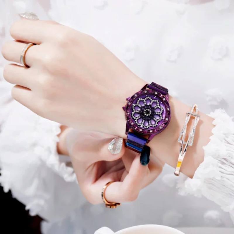 Жіночий годинник з циферблатом, що обертається, підійде до будь-якого вбрання і стане чудовою прикрасою для модниці. Магнітний металевий ремінець приємно облягає зап’ястя руки, а циферблат, прикрашений дрібними камінцями, надає ефектного та елегантного вигляду. Кварцовий механізм відрізняється надійністю та точністю, а корпус виконаний із високоякісних матеріалів.