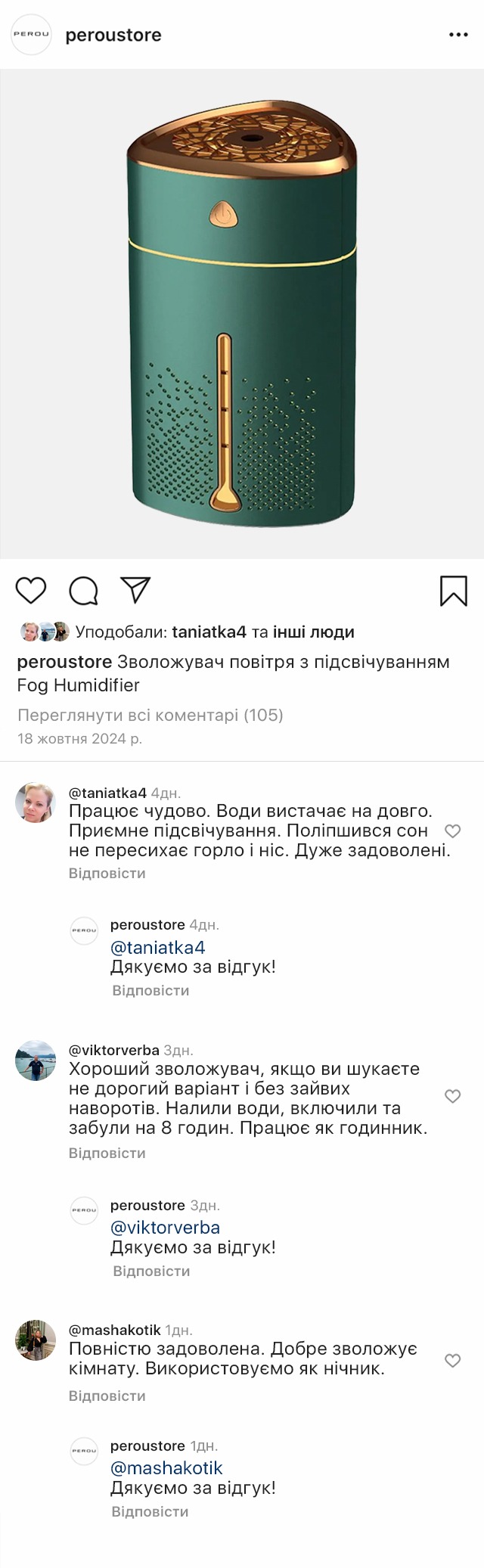 Вмикається кнопкою на передній панелі. Об’єм резервуару становить 1000 мл. Модель являє собою комбінацію зволожувача та очищувача повітря. Має чотири режими роботи.